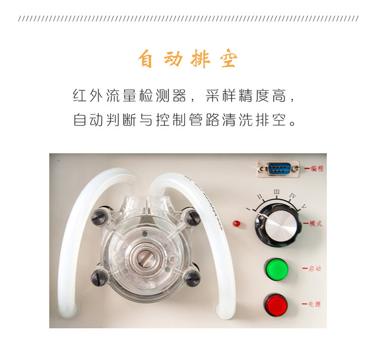 2、紅外流量檢測(cè)器,采樣精度高,自動(dòng)判斷與控制管路清洗排空;