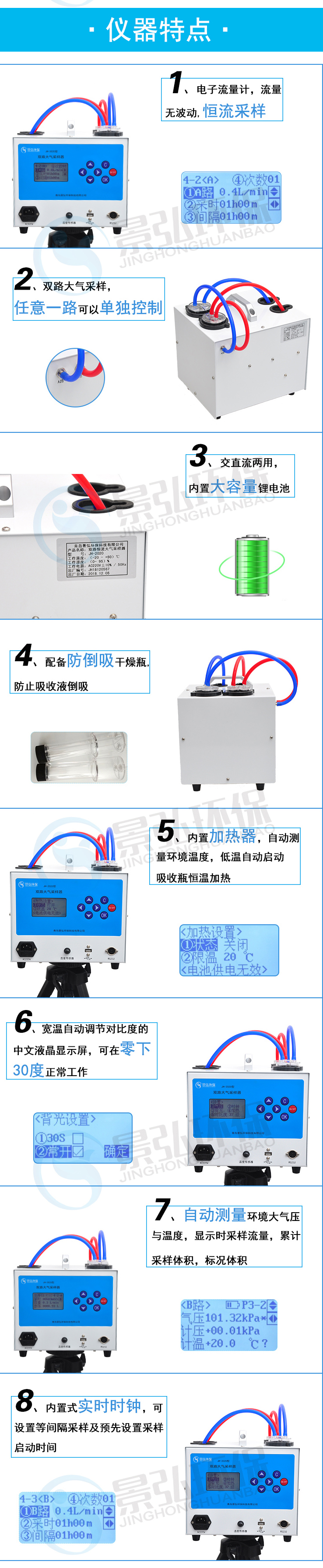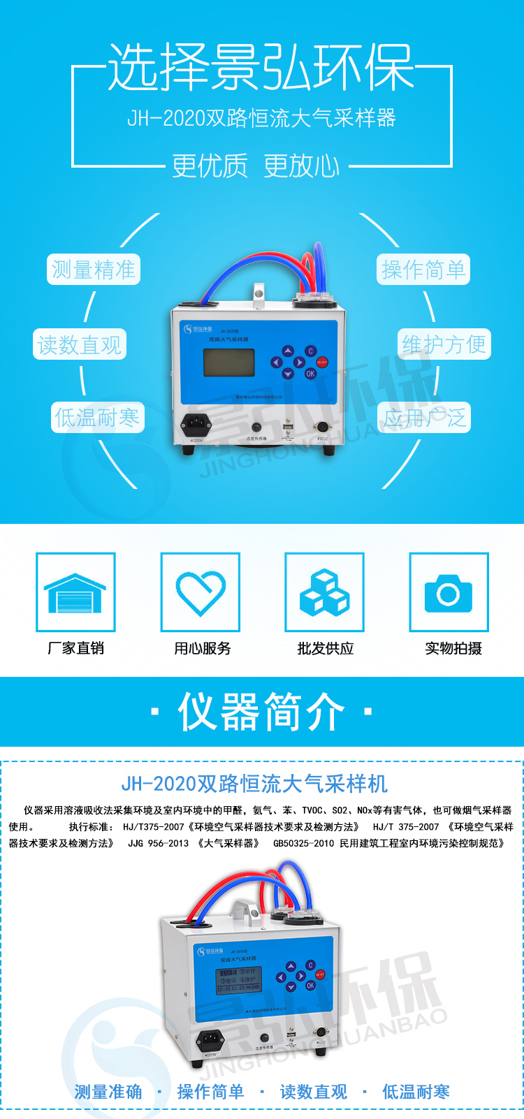 JH-2020型恒溫恒流連續(xù)自動大氣采樣器應(yīng)用溶液吸收法連續(xù)24小時恒溫、恒流采集環(huán)境空氣中的SO2、NOx等各種污染性氣體。適用于環(huán)境監(jiān)測、環(huán)境評價(jià)、衛(wèi)生、安監(jiān)、軍事、科研、教育等部門用于氣態(tài)物質(zhì)常規(guī)監(jiān)測。