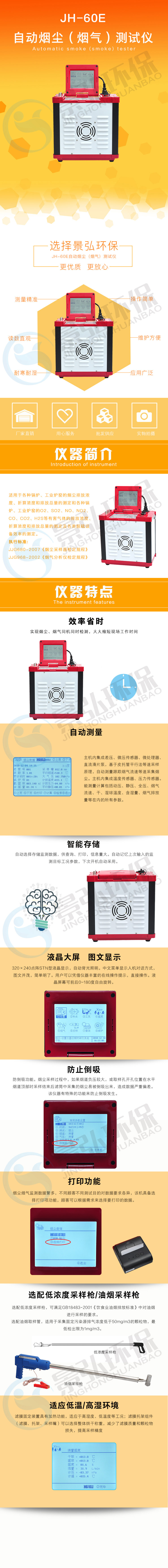 JH-60E型自動(dòng)煙塵(氣)測(cè)試儀是依據(jù)國(guó)家檢定規(guī)程JJG680-2007《煙塵采樣器檢定規(guī)程》JJG968-2002《煙氣分析儀檢定規(guī)程》,吸取國(guó)內(nèi)外同類(lèi)儀器之優(yōu)點(diǎn)的智能型煙塵煙氣測(cè)試儀,該機(jī)技術(shù)性能指標(biāo)符合國(guó)家環(huán)保局頒布的煙塵煙氣采樣儀的有關(guān)規(guī)定,實(shí)現(xiàn)煙塵、煙氣同機(jī)采樣及檢測(cè),大大縮短現(xiàn)場(chǎng)工作時(shí)間。適用于各種鍋爐、工業(yè)爐窯的煙塵排放濃度、折算濃度和排放總量的測(cè)定和各種鍋爐、工業(yè)爐窯的O2、SO2、NO、NO2、CO、CO2、H2S等有害氣體的排放濃度、折算濃度和排放總量的測(cè)定及各類(lèi)脫硫設(shè)備效率的測(cè)定。