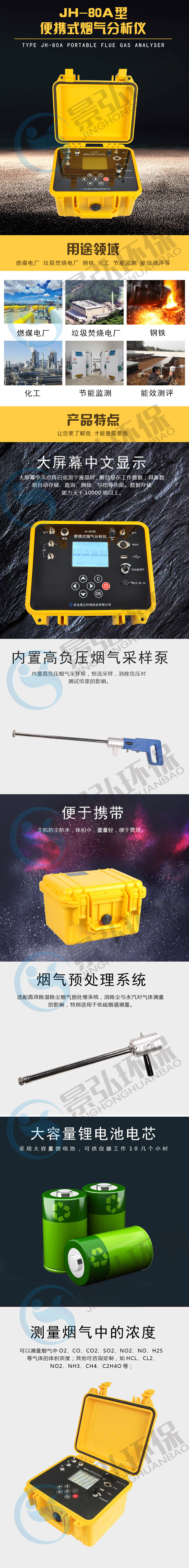 JH-80A型便攜式煙氣分析儀主要采用NDIR非分光紅外和電化學(xué)技術(shù),用于直接測(cè)量煙氣中的O2、CO、CO2、SO2、NO2、NO、H2S等氣體的濃度(其他可咨詢定制,如HCL、CL2、NO2、NH3、CH4、C2H4O等)。配套測(cè)溫一體化采樣槍,同時(shí)測(cè)量煙氣溫度、煙氣壓力及流速等參數(shù)。該產(chǎn)品的主要特點(diǎn)是精度高、體積小、攜帶方便、操作簡(jiǎn)單,主要應(yīng)用于燃煤電廠、垃圾焚燒電廠、鋼鐵、化工、節(jié)能監(jiān)測(cè)、能效測(cè)評(píng)、燃燒研究等領(lǐng)域。