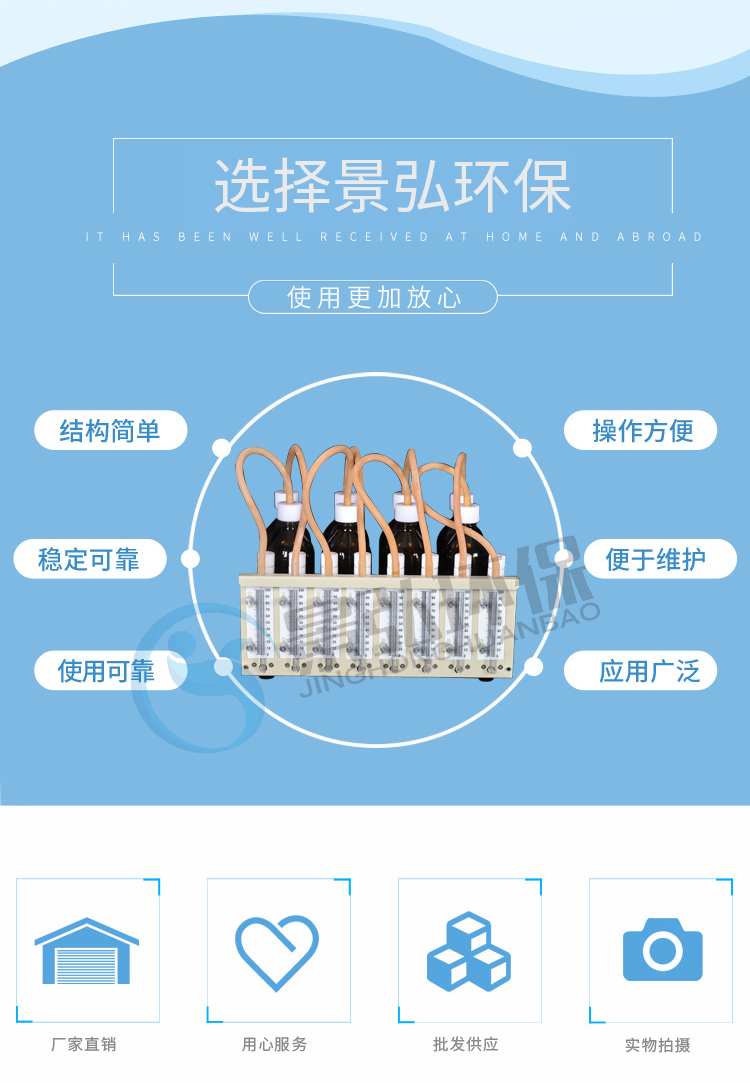 目前BOD測(cè)定方法,主要是用化學(xué)稀釋法,其方法繁鎖,工作量大,高倍數(shù)稀釋時(shí)往往會(huì)引起較大誤差。JH-CY型直讀BOD5測(cè)定裝置的測(cè)定原理是把水樣或經(jīng)過預(yù)處理的水樣注入培養(yǎng)瓶?jī)?nèi),同時(shí)放入二氧化碳吸收劑(NaOH),然后將培養(yǎng)瓶密封置于20±1℃的恒溫箱內(nèi),在一定攪拌速度下對(duì)培養(yǎng)瓶?jī)?nèi)試樣進(jìn)行培養(yǎng)。由于好氣微生物的反應(yīng),將消耗水中的氧氣,呼出二氧化碳,如果我們及時(shí)地用NaOH吸收生成的二氧化碳,培養(yǎng)瓶?jī)?nèi)上部空間的氧氣不斷地供給試樣中微生物的需氧量,這就造成了氣體氧分壓的下降,用差壓計(jì)測(cè)出氧分壓的下降量就可以測(cè)出水樣的BOD值。