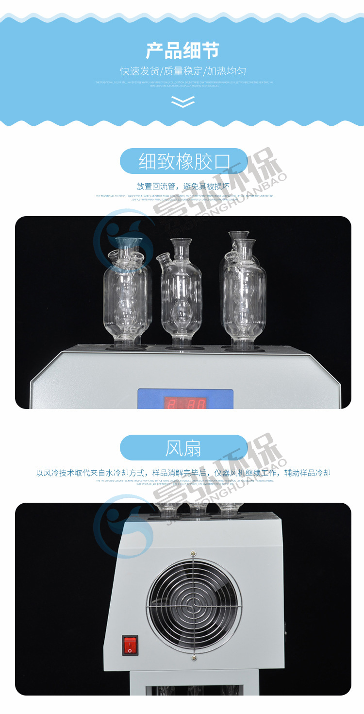 儀器采用微機技術(shù)進行定時控制加熱電爐,可對6個消解器瓶回流裝置同時進行加熱。從而達到節(jié)能增效的目的。 該儀器采用玻璃玻璃毛刺回流管代替球形回流管,并以風冷技術(shù)取代水冷,從而提高儀器的穩(wěn)定性和安全性。