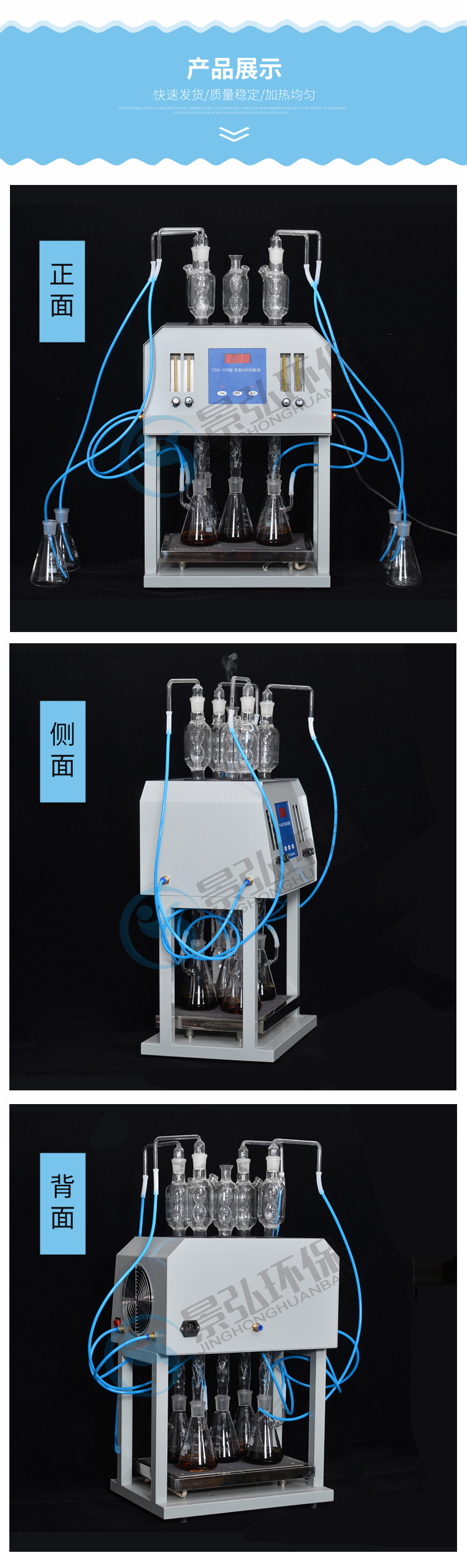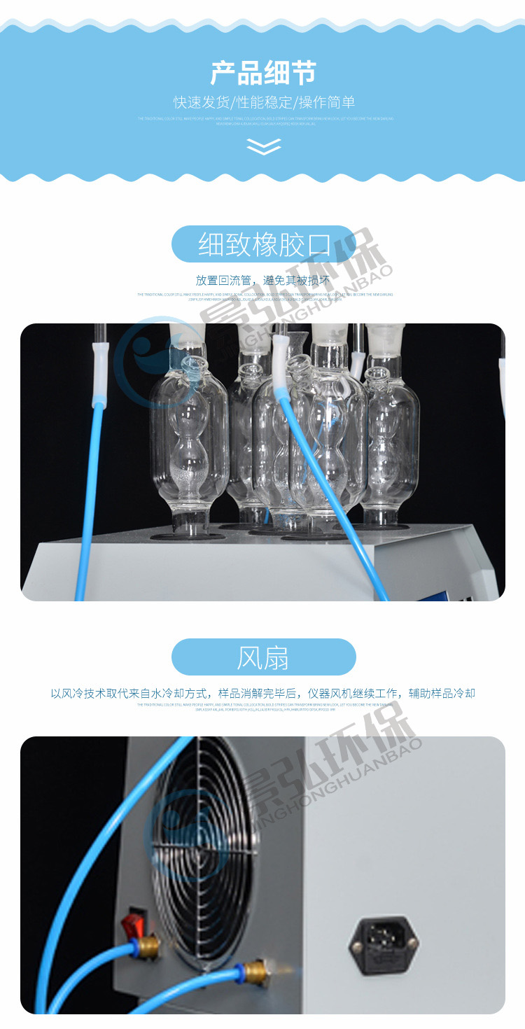 2、采用玻璃毛刺回流管代替球形回流管,并以風(fēng)冷技術(shù)取代自來水冷卻方式,既可以節(jié)水又能使儀器規(guī)范化,同時(shí)還提高了儀器使用的安全性。