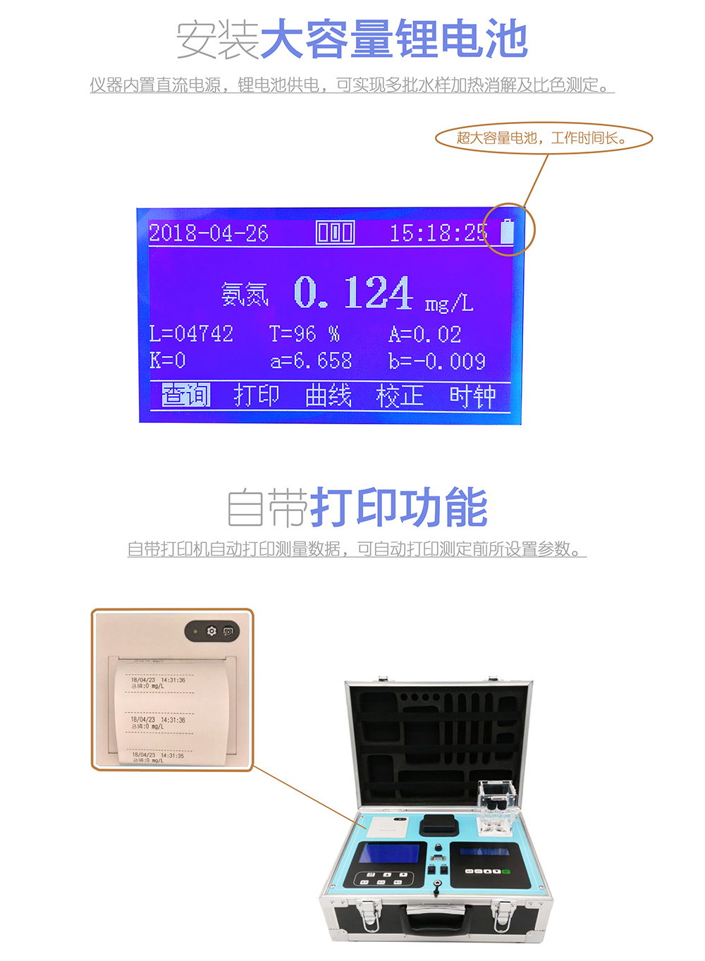 14.儀器內(nèi)置直流電源,鋰電池供電,可實(shí)現(xiàn)多批水樣加熱消解及比色測(cè)定。