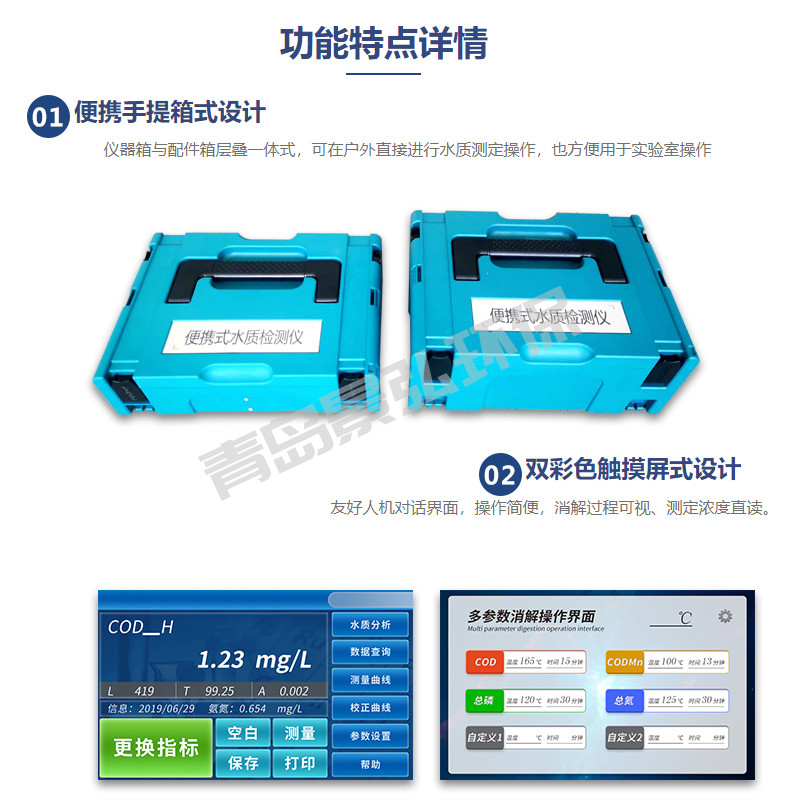 ●便攜手提箱式設(shè)計(jì),儀器箱與配件箱層疊一體式,可在戶外直接進(jìn)行水質(zhì)測定操作,也方便用于實(shí)驗(yàn)室操作;