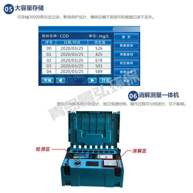 ●儀器內(nèi)置直流電源, 大容量鋰電池供電,可在無市電的情況下,通過儀器自身帶的鋰電池,實(shí)現(xiàn)多批水樣加熱消解及比色測定。